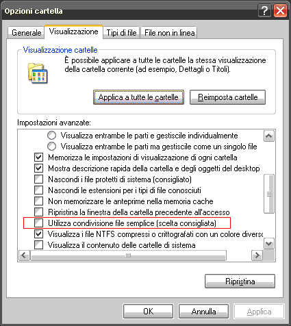 - Deselezionare la voce "Utilizza Condivisione di file Semplice (scelta consigliata)" come in figura: