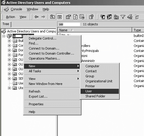 Le login (o UserName) le creeremo con l’iniziale del nome ed il cognome per esteso, ad esempio la login di Mario Rossi sarà mrossi e la password sarà formata da almeno 8 caratteri e composta da numeri e lettere.Per creare gli utenti apriamo “Utenti e Computer di Active Directory” nel menù “Strumenti di Amministrazione” sul server Domani Controller (DC1).