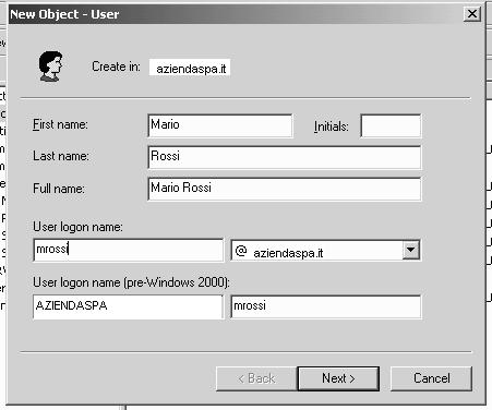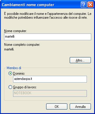 Riavviare il Client ed entrare in rete con il nome dell’utente (ad esempio mrossi), la sua password e selezionare dalla lista il dominio prescelto (aziendaspa).