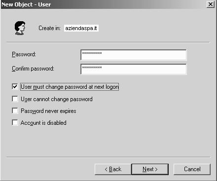 A questo punto inseriamo una password provvisoria (ad esempio mariorossi12345) e clicchiamo su “L’utente deve cambiare password al prossimo logon” in modo tale che istruiremo il signor Mario Rossi ad entrare nel suo PC come mrossi con password mariorossi12345 ma la prima volta gli viene chiesto di modificare la password a suo piacimento.