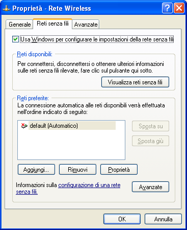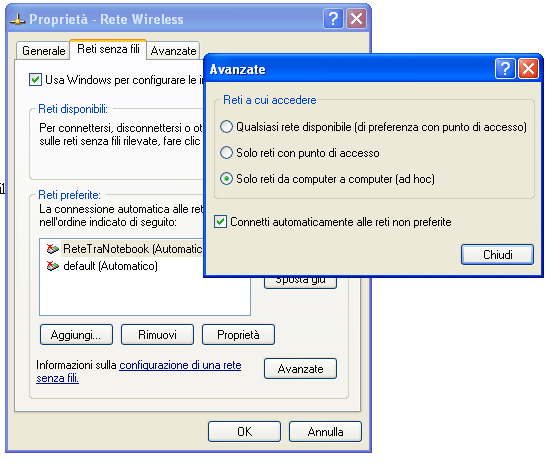 Figura HChiudiamo la mascherina (figura H) con un solo OK e tornati sulla precedente finestra (figura I), clicchiamo su Avanzate e selezioniamo "Solo reti da Computer a Computer (ad Hoc)" e su "Connetti automaticamente..."