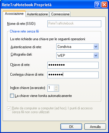 - autenticazione condivisa WEP per avere la crittografia dei dati (o meglio ancora, se la scheda lo permette la WPA);